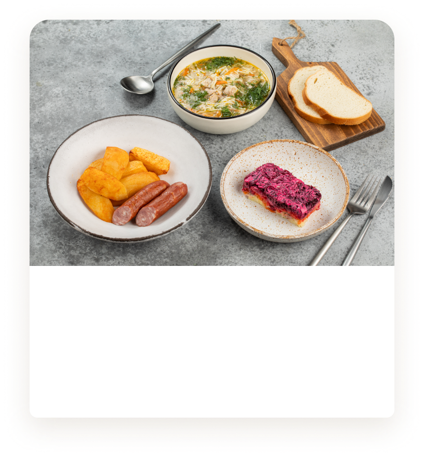 Сельдь под шубой (120г), суп-лапша куриная (350г), колбаски охотничьи (75г), картофель по - деревенски (150г), белый хлеб (40г), одноразовая посуда (1шт)