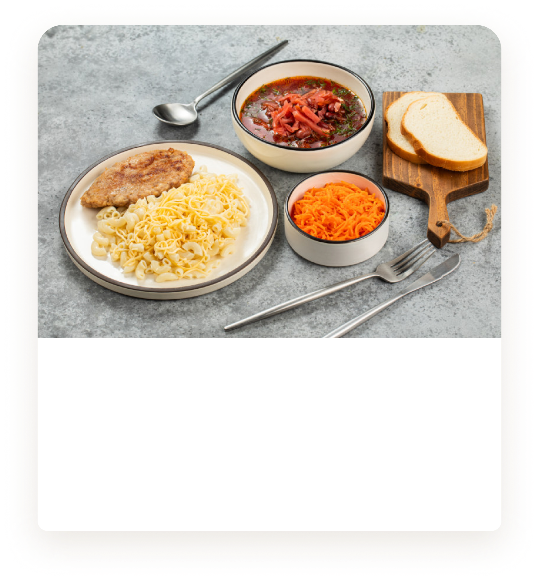 Морковь по-корейски (120г), шницель говяжий (100г), макароны с сыром (150/20г), борщ Сибирский с фасолью (350г), белый хлеб (40г), одноразовая посуда (1шт)