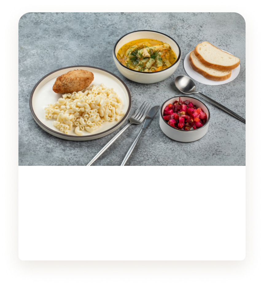 Рассольник Ленинградский (350г), котлета Питерская (120г), макароны отварные (150г), винегрет (120г), белый хлеб (40г), одноразовая посуда (1шт)